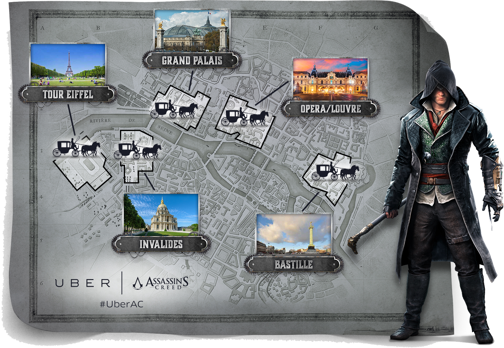 Pas besoin de traverser la Manche, Uber et Ubisoft s’associent pour offrir l’opportunité à leurs utilisateurs de commander gratuitement des calèches #UberAC via l’application Uber. Ces calèches, tout droit venues de 1868, seront accompagnées de l’Assassin Jacob Frye et disponibles dans 5 quartiers de Paris :